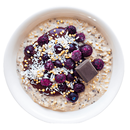 40g sitne zobi, 10g chia sjemenki, 200 ml bademovog mlijeka, 15g whey proteina, okus po izboru. DODACI: 50g zamrznutih borovnica, malo kokosa, 20g tamne čokolade