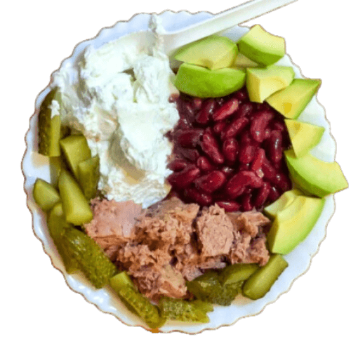 80g tune u vlastitom soku 40g kiselih krastavaca 80g avokada 150g Pilos sira 0.3% m.m. 150g graha iz konzerve